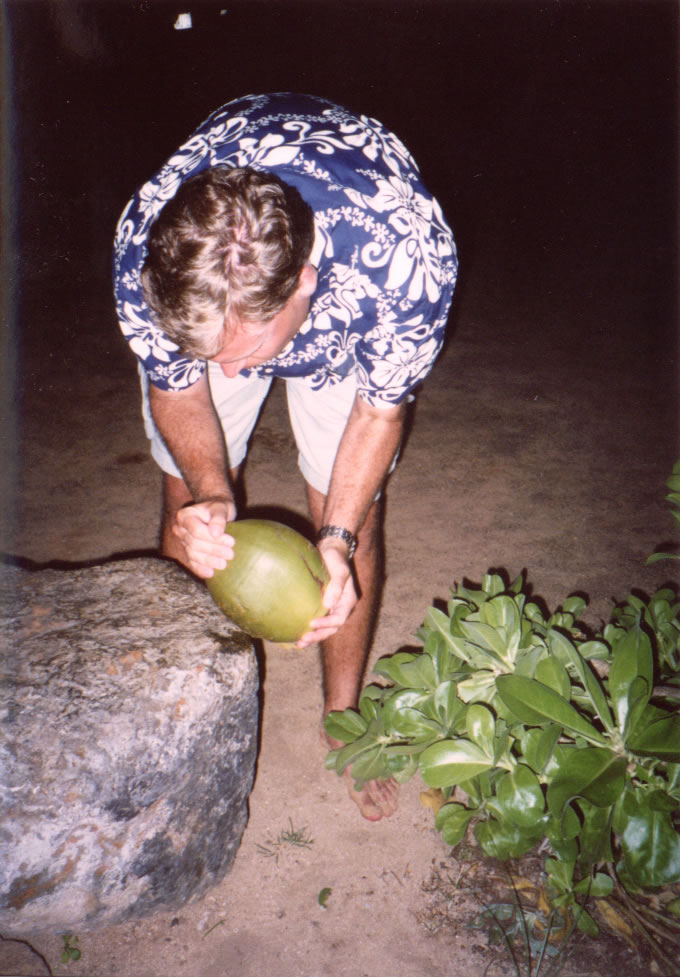 Jeff trying to open a coconut. (He picked it from a tree at a golf course.)