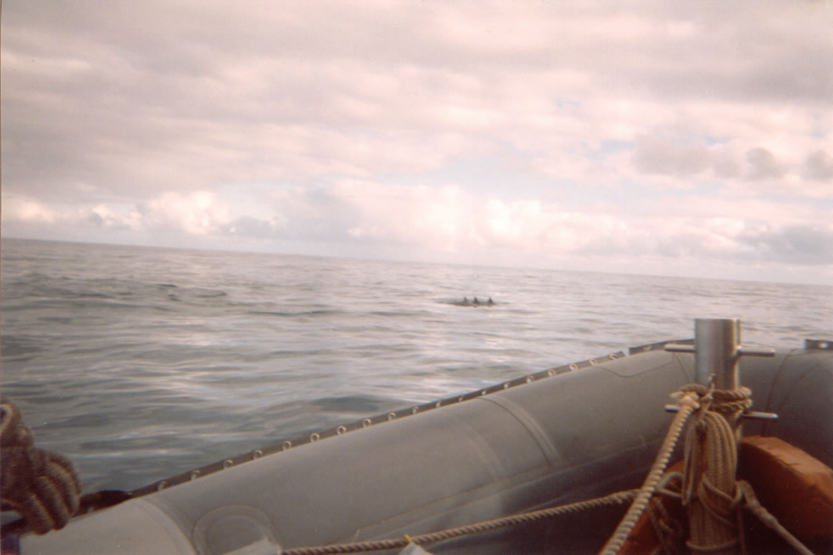 Three dolphins, seen from a raft. We were on a trip around Kauai's North Shore. Our guide estimates there were at least 50 dolphins in this pod. They hung around for about 15 minutes.